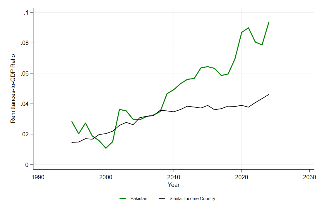 Those sacrifices add up. Remittances to Pakistan are now about 38 billion dollars a year, roughly 10% of GDP. Pakistan stands out globally for how large these flows are relative to the size of its economy. The chart below plots Pakistan’s remittances-to-GDP ratio over time (green line) against that of a “typical” developing country with similar GDP per capita (black line, estimated via a regression). Pakistan’s remittances have climbed steadily and are now about twice as large as what you’d expect for a country at this income level.